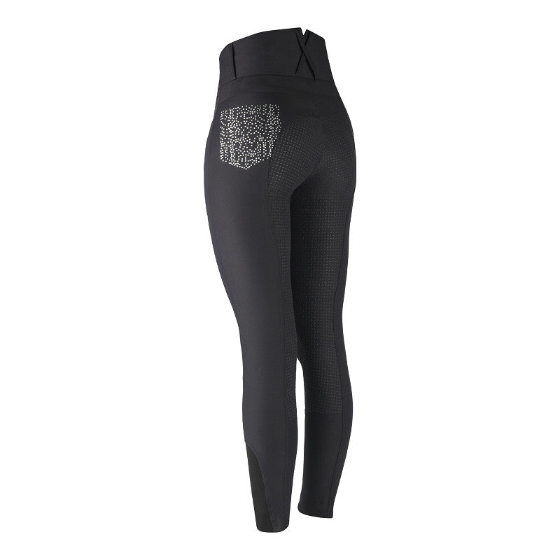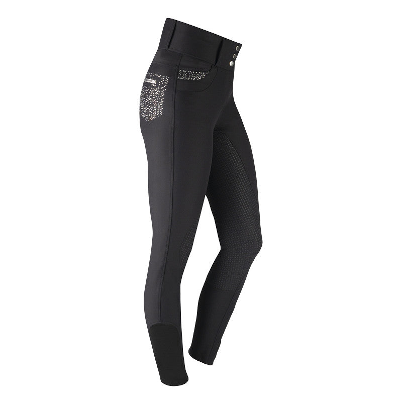 Pantalon d'équitation élégant en tissu Aqua X fonctionnel. L'Élégance présente une taille haute avec 3 boutons à l'avant et une découpe en V à l'arrière. Ce pantalon d'équitation est doté de poches suffisamment profondes pour ranger un téléphone portable. Caractéristiques du produit : Déperlant, régulant l'humidité et respirant : taille haute avec découpe en V à l'arrière, 3 boutons pour passants de ceinture et deux fausses poches arrière, pois argentés et dorés sur les poches avant et arrière, fond intégral en silicone grain de riz. Composition : 38 % nylon, 50 % Aqua X, 12 % élasthanne.