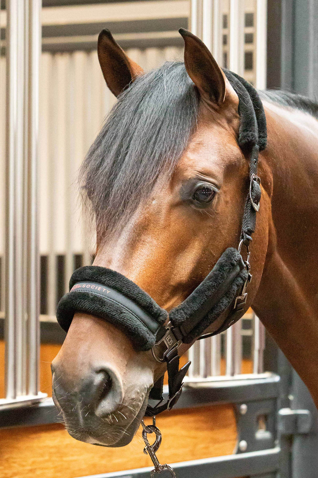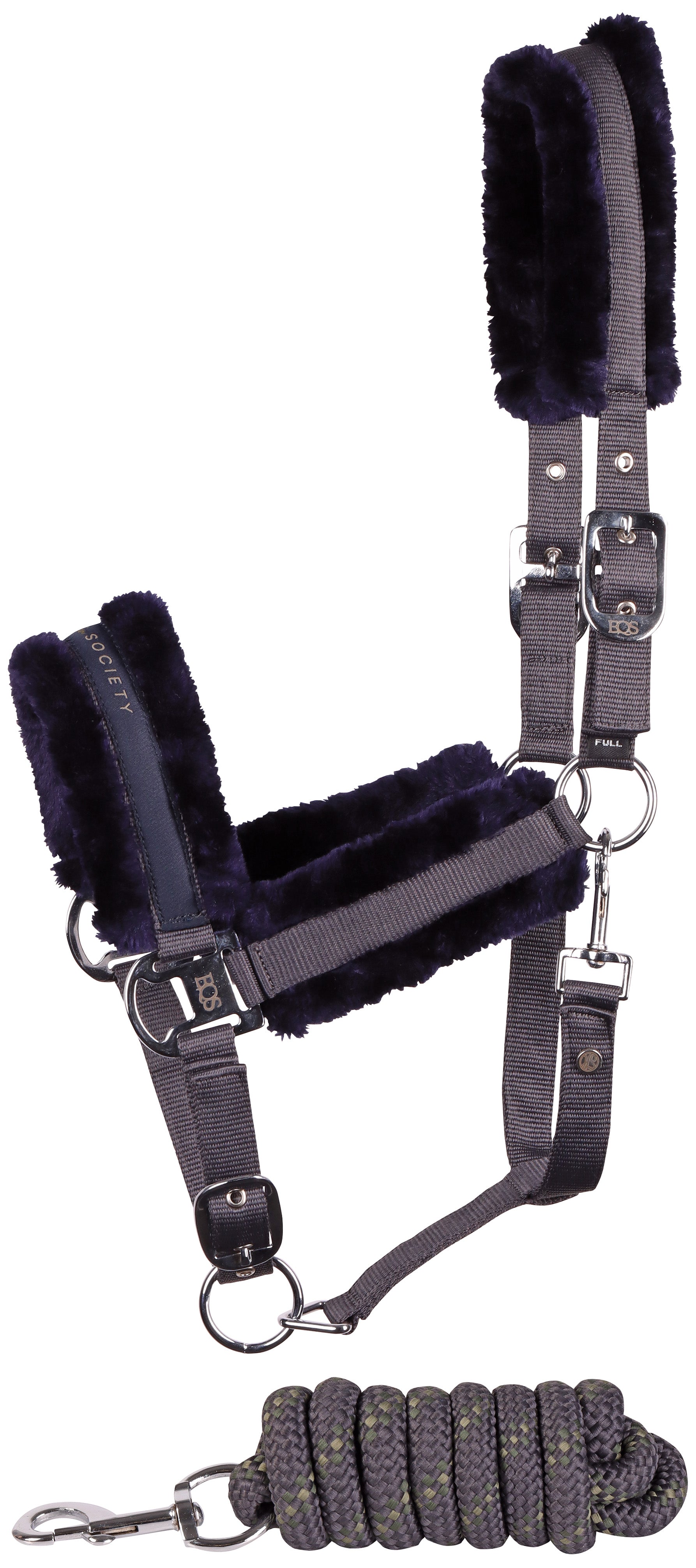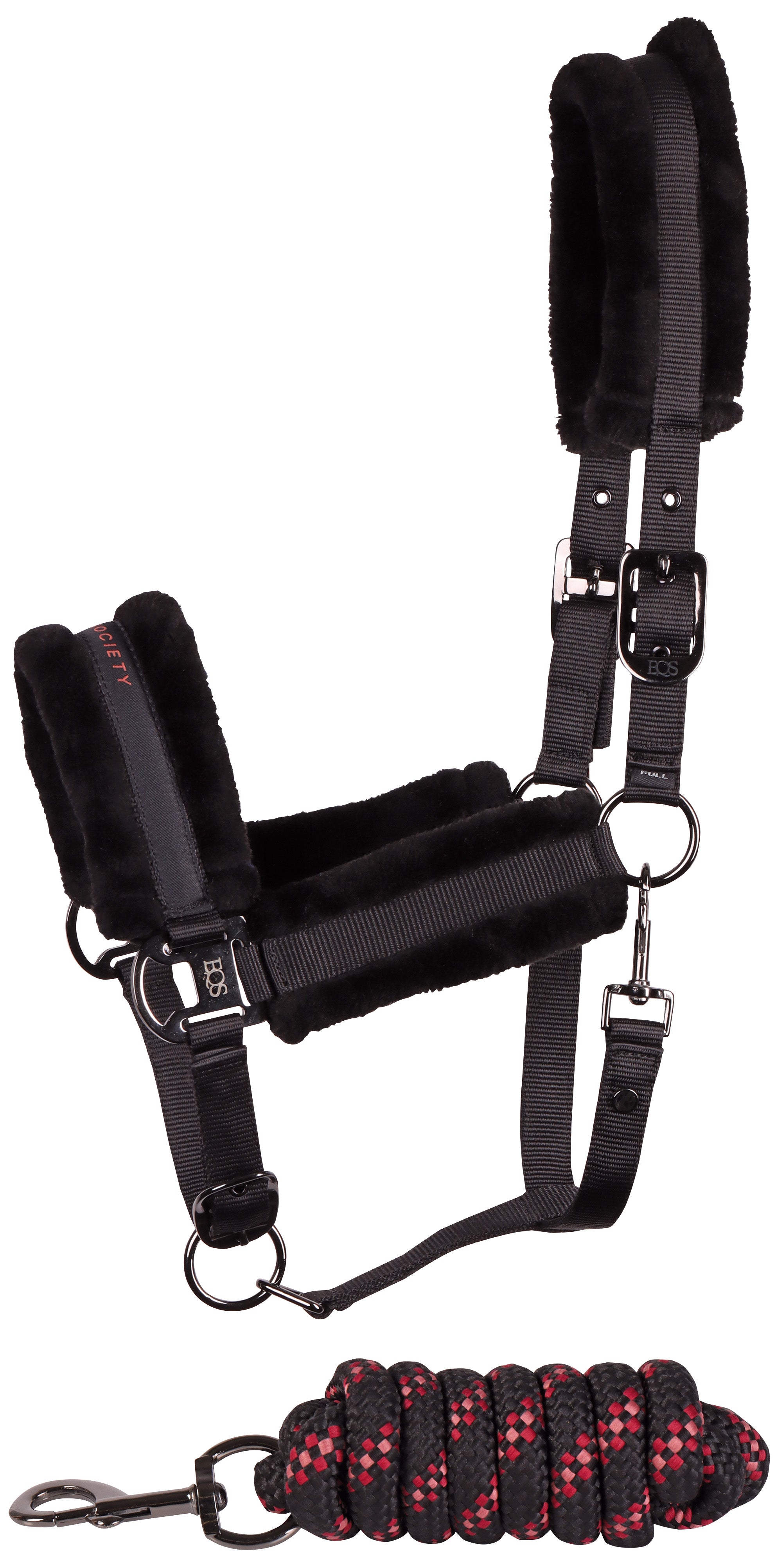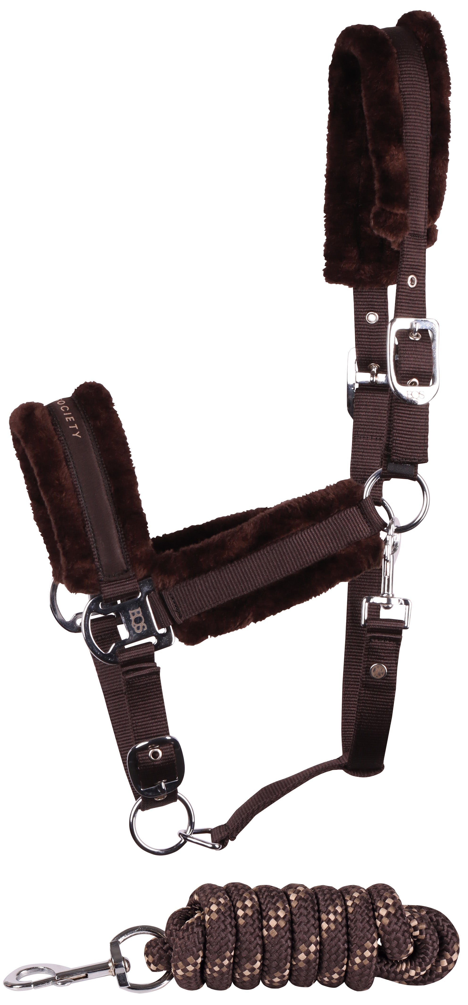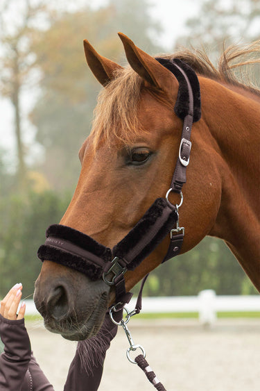 Halsterset met Equestrian Society logo op de neus, met zacht kunstbont onderlegd, verstelbaar aan twee kanten van het kopstuk en op de neus, inclusief een halstertouw van 2 meter lengte.