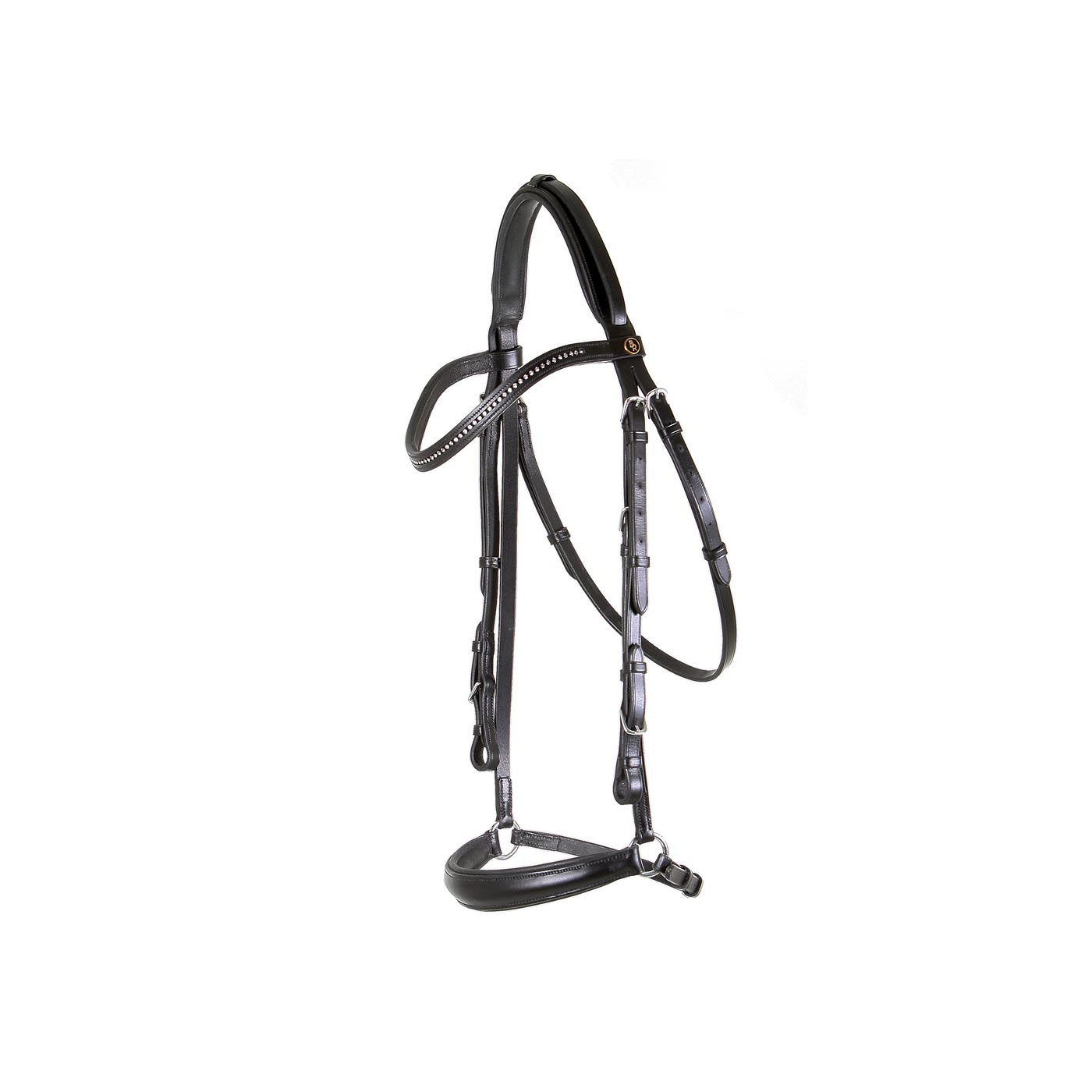 Bride avec têtière légèrement rembourrée. La muserolle s'étend sur toute la têtière. Le frontal incurvé est incrusté de cristaux autrichiens et doublé de cuir souple. La muserolle de dressage est ronde, relevée et légèrement rembourrée. La bride est ornée d'une bouclerie ronde, brillante et argentée. Rênes non incluses.