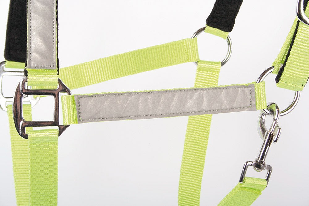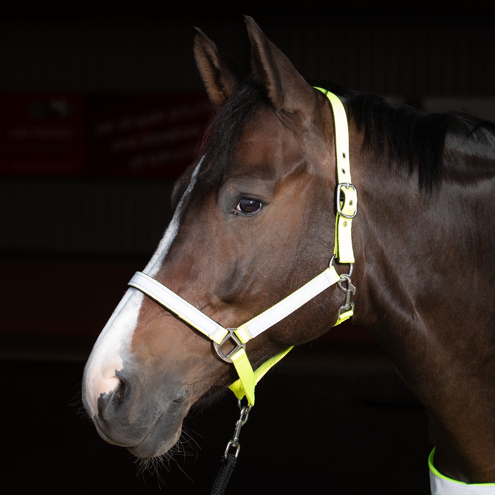 Halster in opvallende gele kleur met reflectie materiaal op de neusband en bakstukken om je paard beter zichtbaar te maken in het donker.