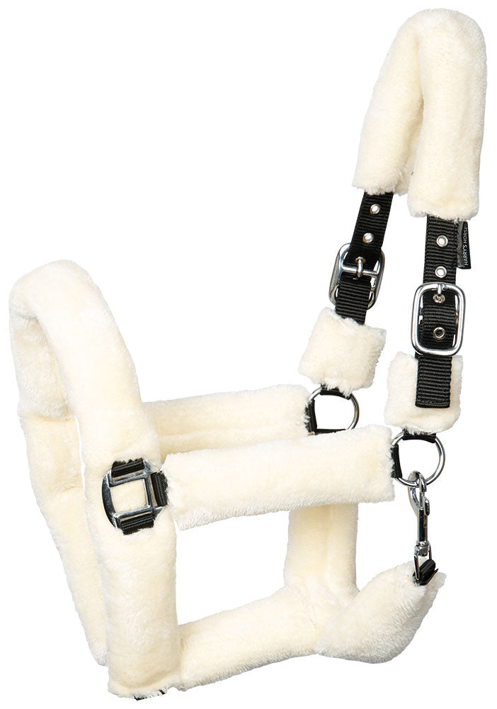 Geheel bekleed met zacht Teddy imitatiebont. Verstelbaar op beide kanten van het kopstuk en aan de kaak. De gaatjes zijn voorzien van ringen. Zilverkleurige fournituren.
