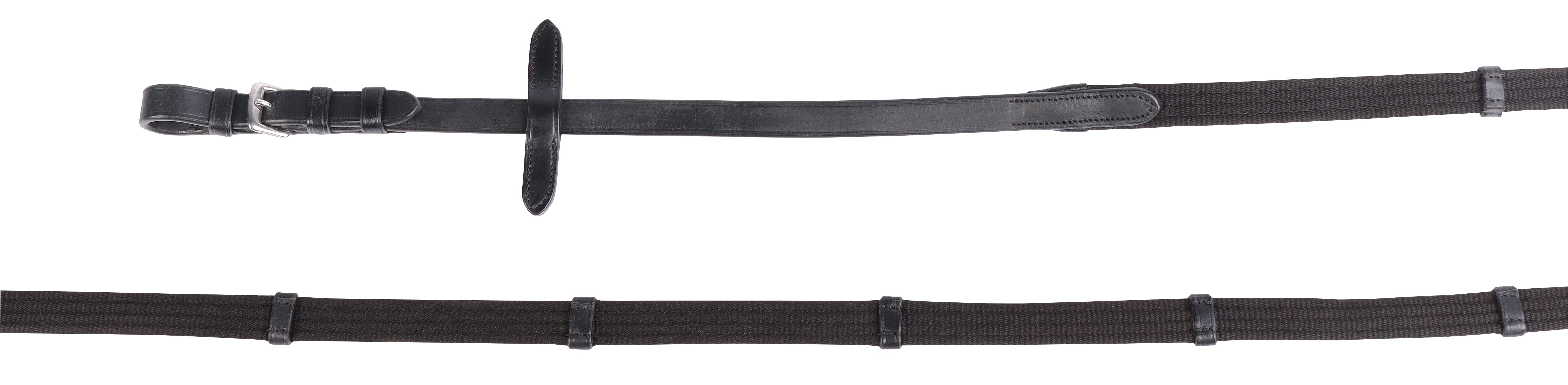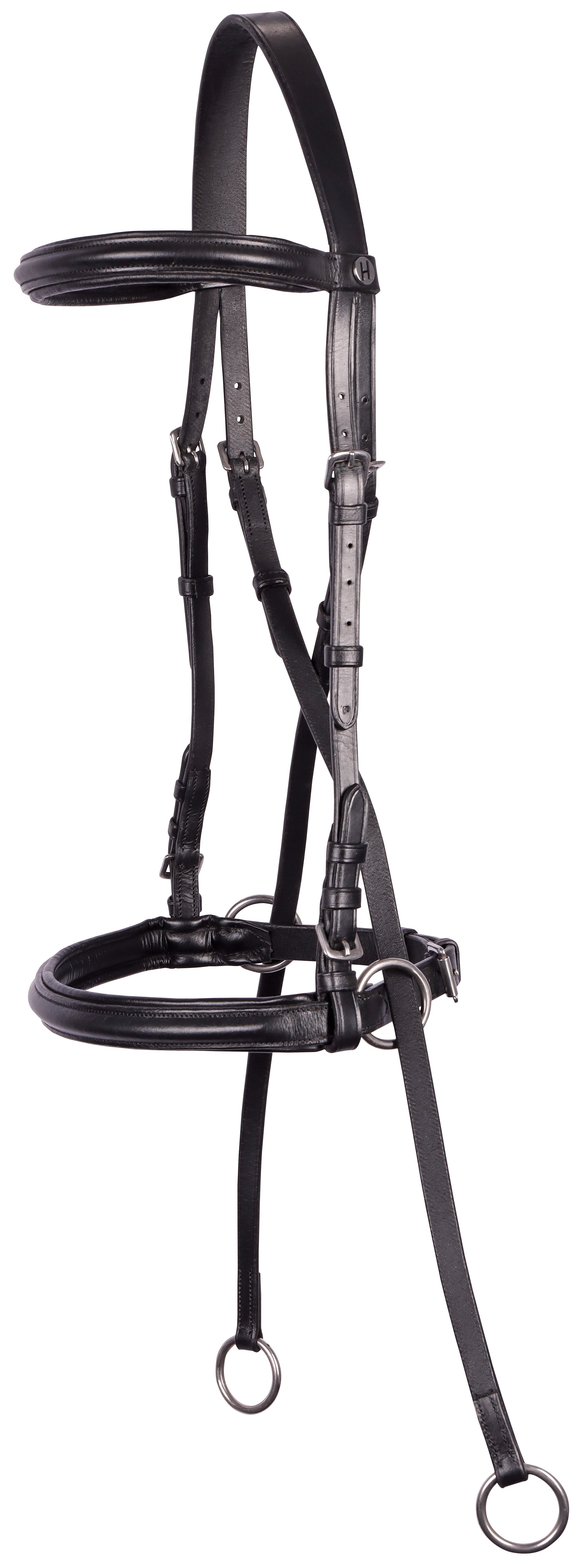 Lederen bitloos hoofdstel met onderlegde front- en neusriem, webband teugels met stops. Teugelvoering kruislings via kin en nek. Wordt geleverd met gebruiksaanwijzing.