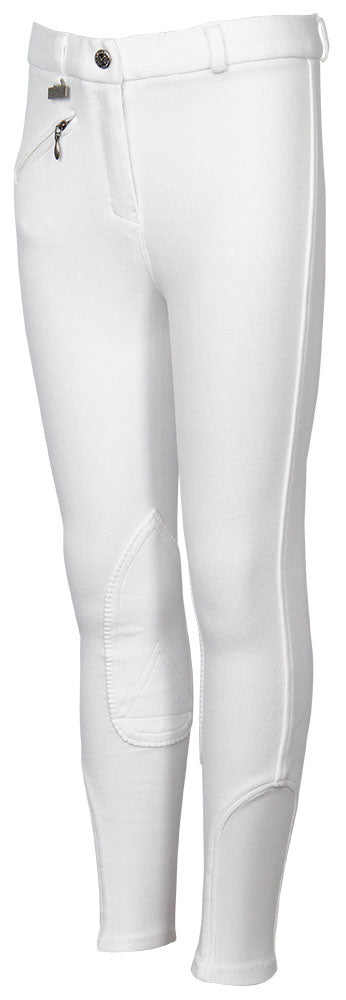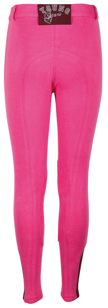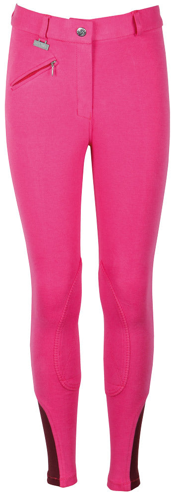 Rijbroek met zakje met ritssluiting, contrast kleur elastische inzet aan de onderzijde van de pijpjes, rondgenaaid zitvlak, leuke badge op de tailleband