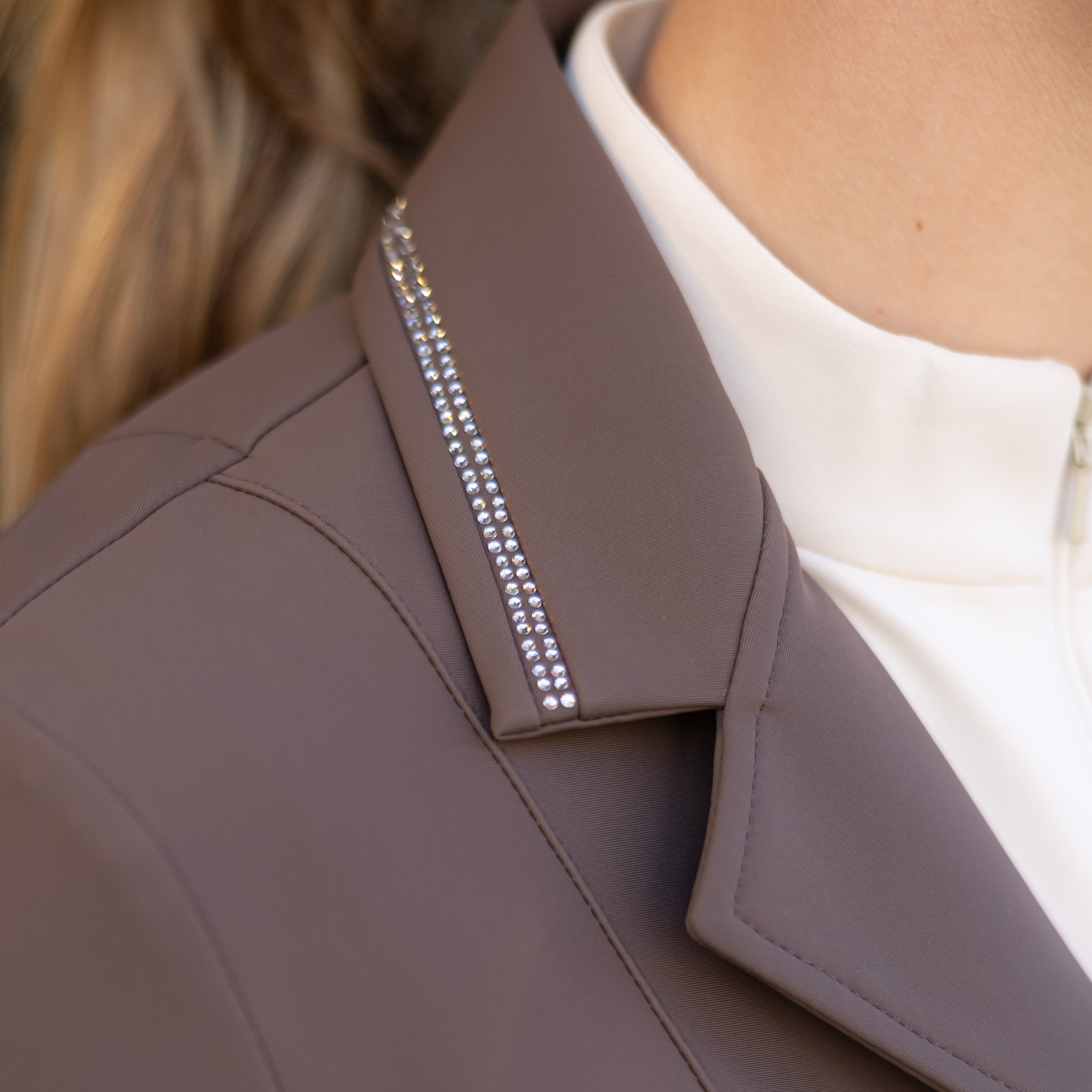 Veste de compétition luxueuse en matière stretch confortable. Elle est ornée de cristaux argentés et crème au col, de deux poches zippées et d'une fermeture boutonnée dissimulant une fermeture éclair pour un ajustement parfait.