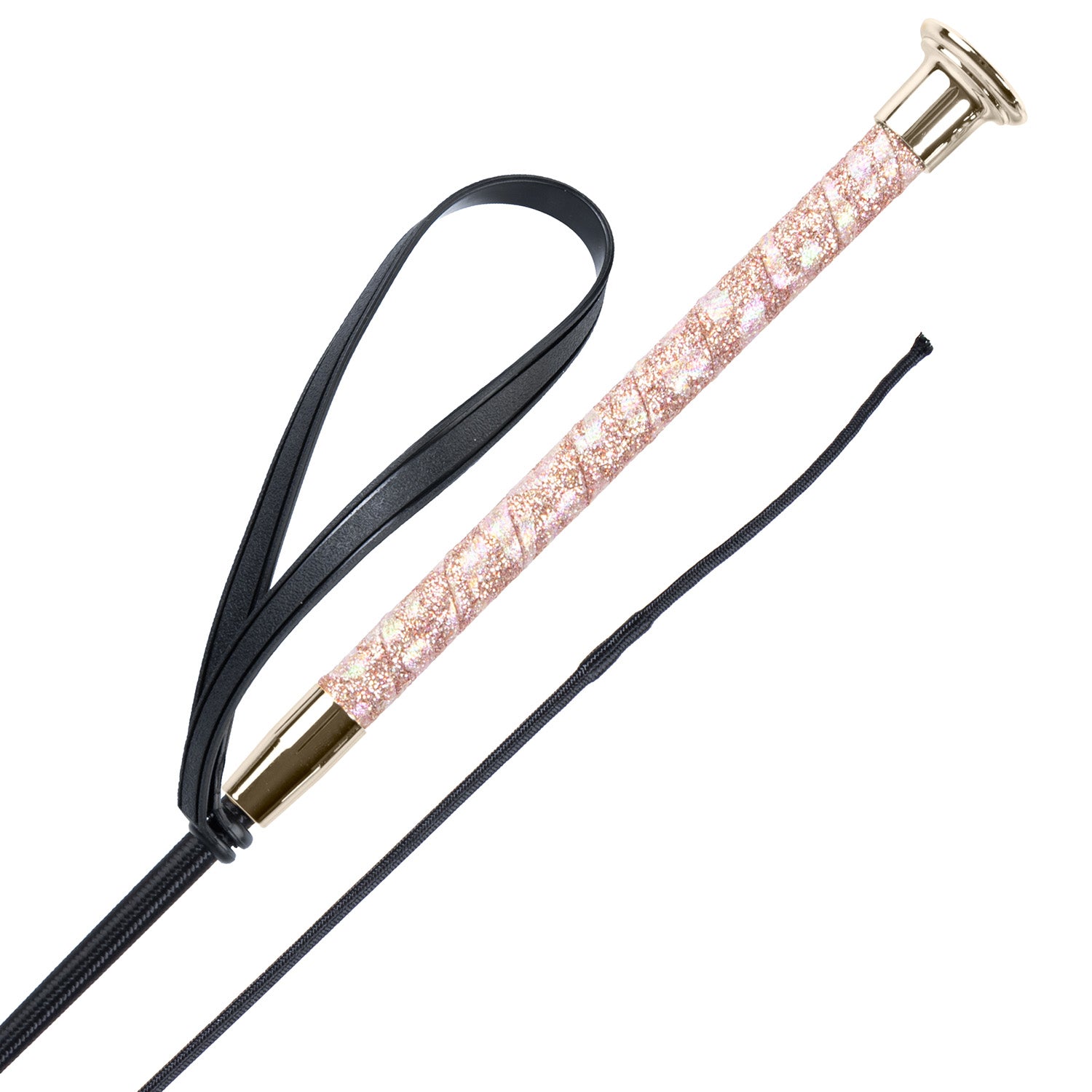 Cravache avec poignée panthère à paillettes colorées et dragonne.