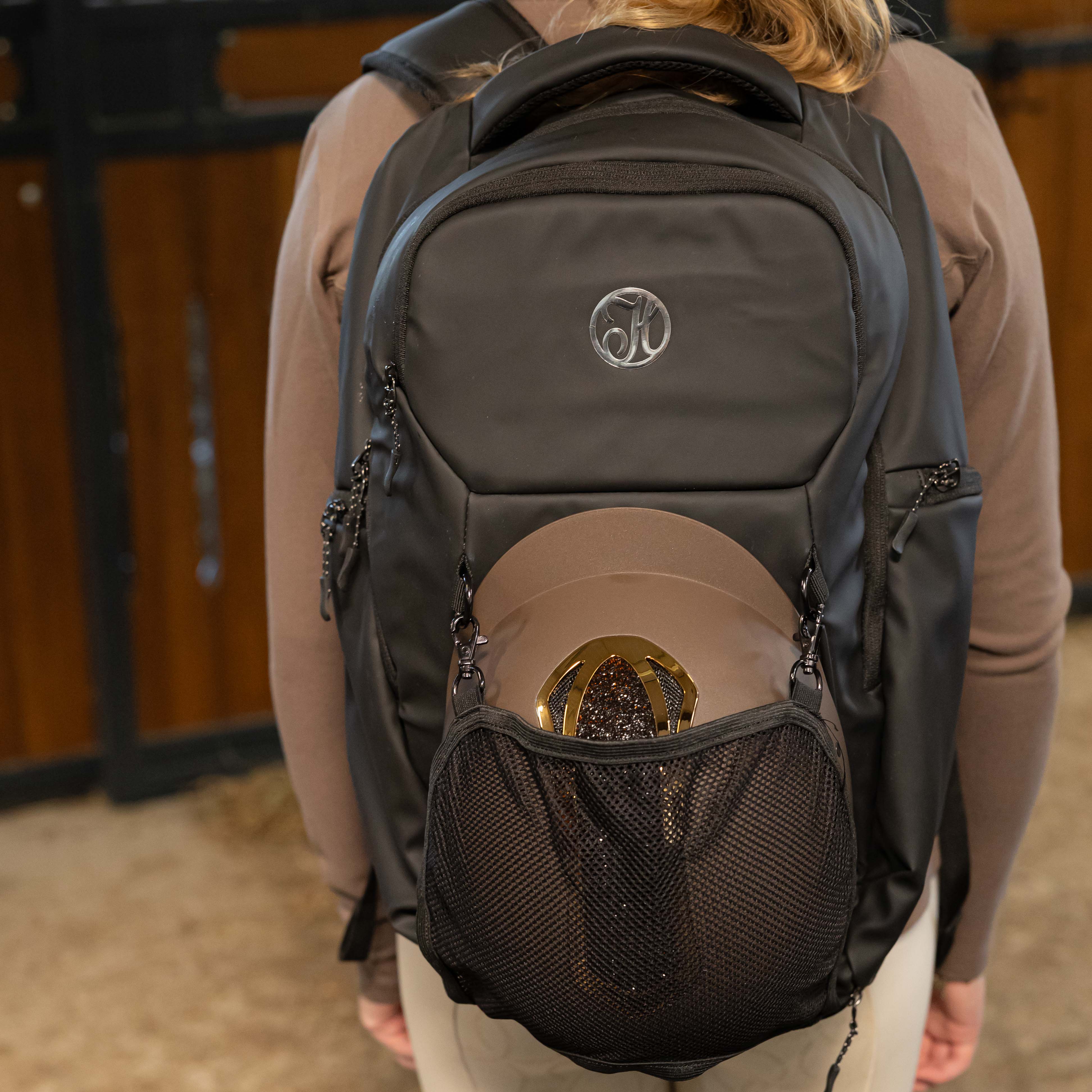 Gevoerd vak voor laptop, paardenpaspoort of belangrijke documenten en een extra mesh vak met ritssluiting voor kleinere items. Ruim hoofdcompartiment geschikt voor borstels, lunchpakket en dergelijke. De buitenkant is voorzien van slimme opbergmogelijkheden: