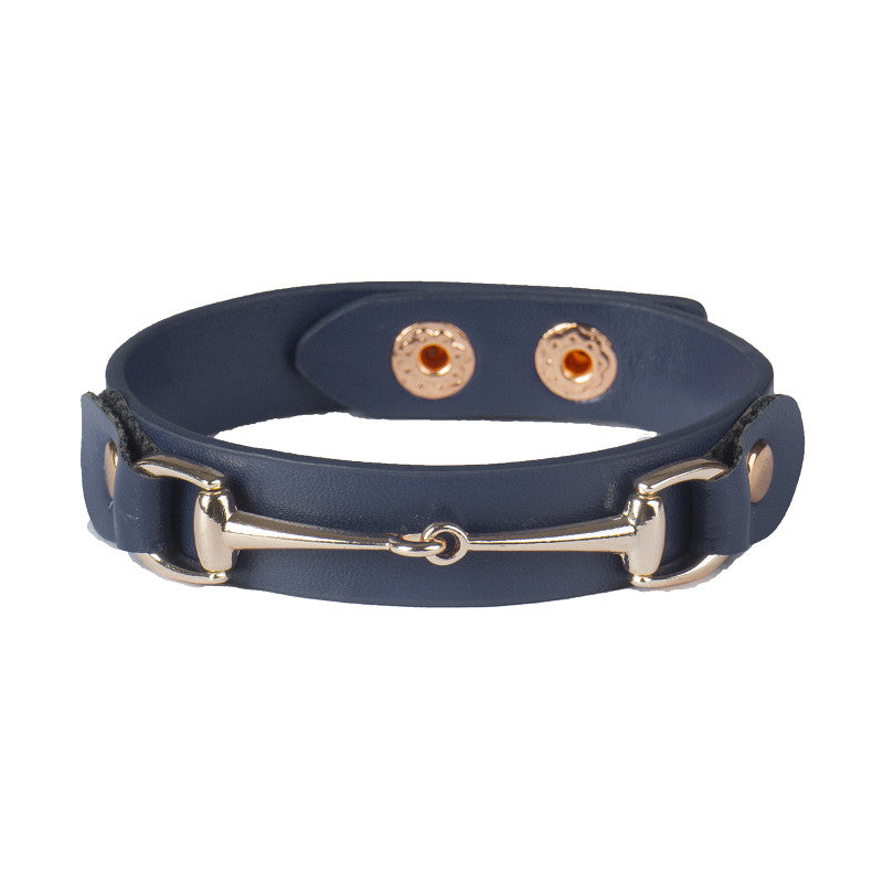 Armband van kunstleder afgewerkt met metalen bitje. Verstelbaar middels 2 drukknopen. Afmetingen: Kortste lengte: 17 cm Langste lengte: 20 cm Materiaal: Kunstleder en metaal