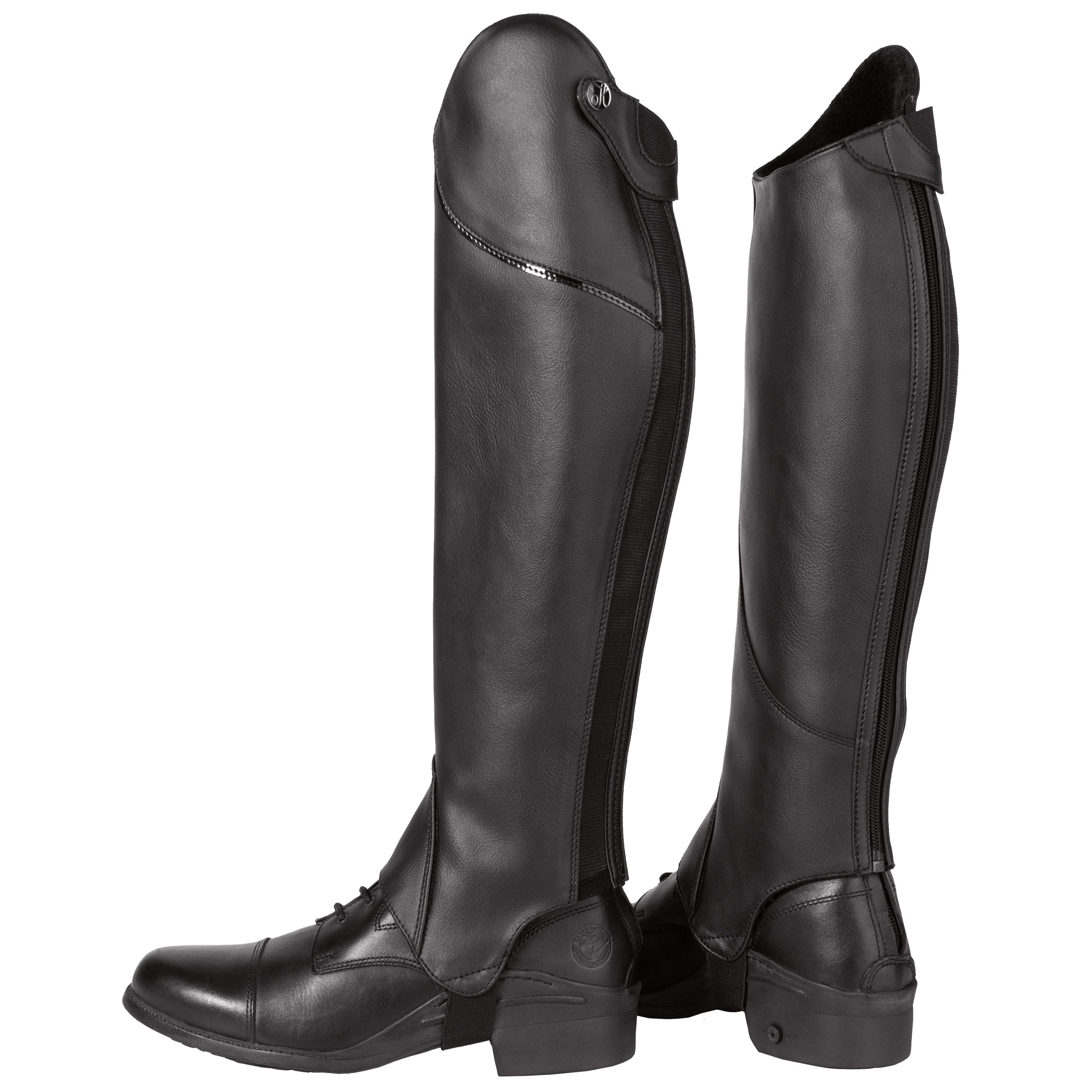 Stijlvolle minichaps met warme voering van kunstbont. Voorzien van een elastisch kuitgedeelte voor een optimale pasvorm en een ritssluiting aan de achterzijde. Afgewerkt met glanzende lakdetails aan de buitenzijde van de kuit voor een elegante uitstraling.