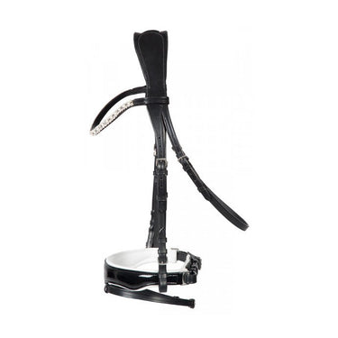 Dit hoofdstel is optioneel verkrijgbaar met een wit of zwart gevoerde neusriem met lak applicatie. Het elegante uiterlijk wordt gecompleteerd door een licht gebogen frontriem met gezette parels en kristalstenen, waardoor het ook een ideale metgezel is voor het toernooiseizoen.