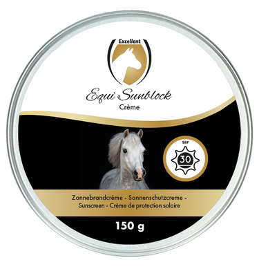 Excellent Horse Sunblock Cream SPF 30 is de perfecte zonnebrandcrème voor paarden en pony's, die maar liefst 24 uur lang bescherming biedt tegen schadelijke UV-straling. Ideaal voor gevoelige en licht behaarde delen van de huid, zoals de neus, mond, oren en onderbenen. De formule trekt snel in de huid, plakt niet en laat geen witte waas achter. Daarnaast is de crème water- en zweetbestendig en daardoor goed te gebruiken tijdens wedstrijden en het trainen. Geschikt voor de gevoelige huid.