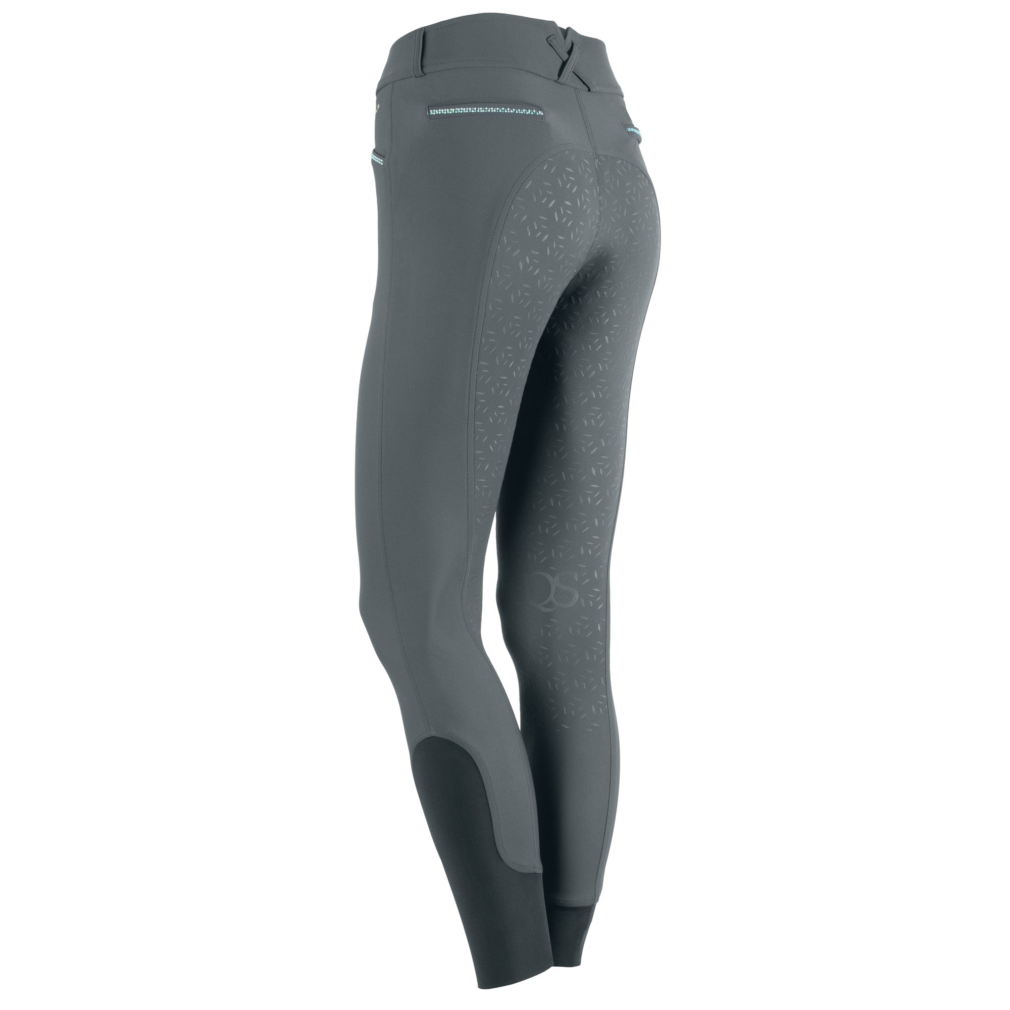 Chique rijbroek gemaak van nylon, met een brede tailleband met V-uitsparing middenachter.Verder met riemlussen, steekzakken en imitatie kontzakjes met kristallen, een rondgenaaid zitvlak met siliconen print en een comfortabele elastische inzet rond de enkels.