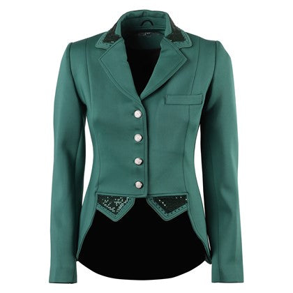 Luxe wedstrijdjasje van hoogwaardig stretch materiaal. Het jasje is uitgevoerd met een crystal knoopsluiting met daaronder een ritssluiting voor perfecte pasvorm, kraag en giletflapjes zijn voorzien van tone/tone pailetten/crystallen en een piping. Sierlijke knopen.