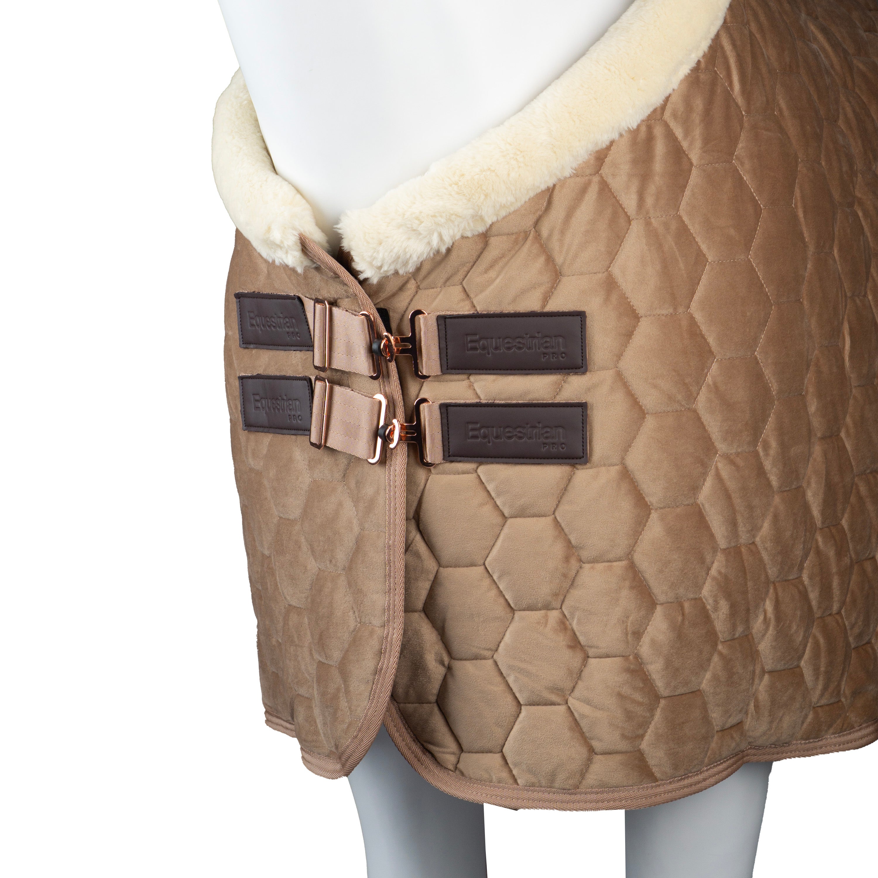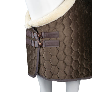 Elegante en comfortabele deken met een stijlvolle fluwelen look en doorgestikt patroon. De zachte fleece kraag en voering bieden extra warmte en comfort. Roségouden details geven de deken een chique uitstraling. De deken is voorzien van een dubbele voorsluiting kruissingels en staartkoord voor een perfecte pasvorm. Productspecificaties: < Elegante showdeken met fluwelen look Gewatteerd patroon Chique fleece kraag en zachte voering Roségouden details Dubbele voorsluiting met kruissingels Afneembaar staartkoord PVC omhuld 200 grams vulling Materiaal:< 100% polyester :